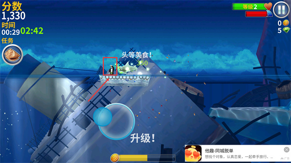 3、吞噬目標(biāo)后可獲得【頭等美食!】類獎(jiǎng)勵(lì),提升分?jǐn)?shù)并推進(jìn)等級(jí),等級(jí)提升會(huì)增強(qiáng)鯊魚的吞噬能力。