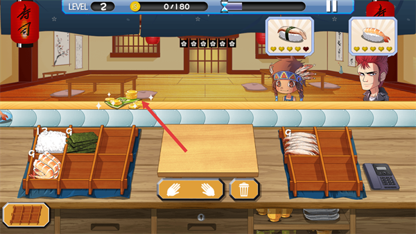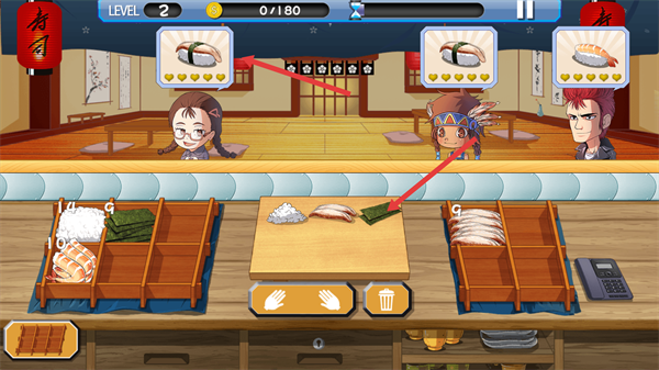 3、查看顧客對(duì)應(yīng)的壽司需求,從食材區(qū)域選取對(duì)應(yīng)食材放置到制作臺(tái),進(jìn)行制作。