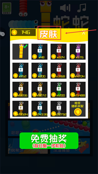 4、在【皮膚】界面中,消耗金幣解鎖不同外觀的蛇形角色。