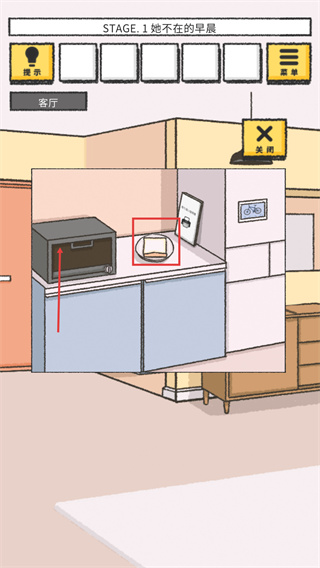 1、在【STAGE.1-她不在的早晨】場景中,先拾取臺面的面包,放入烤箱內(nèi)烤一下,解決早餐。