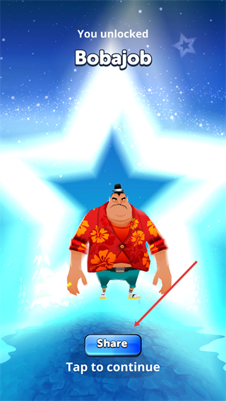 4、解鎖【Bobajob】后會顯示解鎖提示界面,點擊【Tap-to-continue】可返回角色頁面,也可點擊【Share】分享解鎖信息。