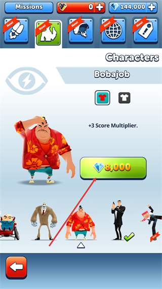 3、選擇【Bobajob】角色,需消耗8,000鉆石解鎖,該角色擁有【+3-Score-Multiplier】的得分增益效果,助力提升關卡得分。