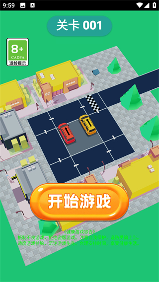 1、在【關(guān)卡】界面,點(diǎn)擊【開始游戲】進(jìn)入移車關(guān)卡,該游戲?yàn)橥\嚱庵i類玩法,需通過移動(dòng)車輛騰出通道。