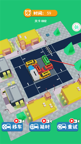 2、需移動(dòng)車輛(如綠色車)到終點(diǎn)線,底部提供【移車】【延時(shí)】【重試】功能按鈕輔助通關(guān)。