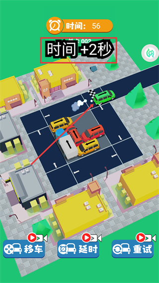 3、移動(dòng)車輛到達(dá)指定區(qū)域后,會(huì)觸發(fā)【時(shí)間+2秒】的增益效果,延長(zhǎng)關(guān)卡倒計(jì)時(shí),助力更充裕地完成移車操作。