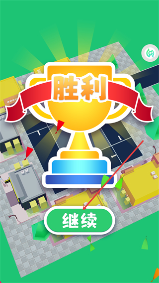 4、關(guān)卡完成后顯示【勝利】界面,點(diǎn)擊【繼續(xù)】按鈕可進(jìn)入下一個(gè)移車關(guān)卡,繼續(xù)挑戰(zhàn)更復(fù)雜的停車解謎布局。