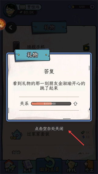 4、看到禮物贈(zèng)送后的答復(fù)彈窗,查看關(guān)系值的變化情況,點(diǎn)擊空白處關(guān)閉該彈窗,完成此次與好友的互動(dòng)流程。