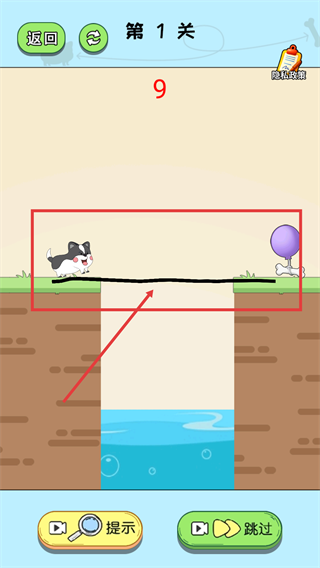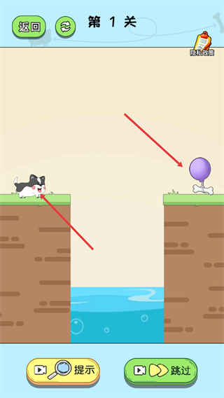 2、進入【第1關(guān)】后,觀察小狗與【紫色氣球-帶骨頭】的位置,可借助【提示】功能了解本關(guān)的核心操作邏輯。