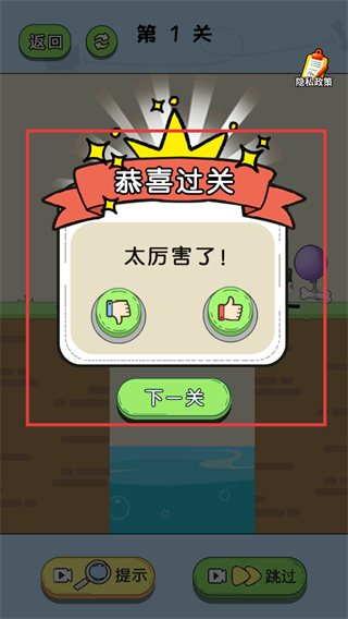 4、完成關(guān)卡操作后觸發(fā)【恭喜過關(guān)】提示,點擊界面中的【下一關(guān)】按鈕,繼續(xù)挑戰(zhàn)后續(xù)的游戲關(guān)卡內(nèi)容。