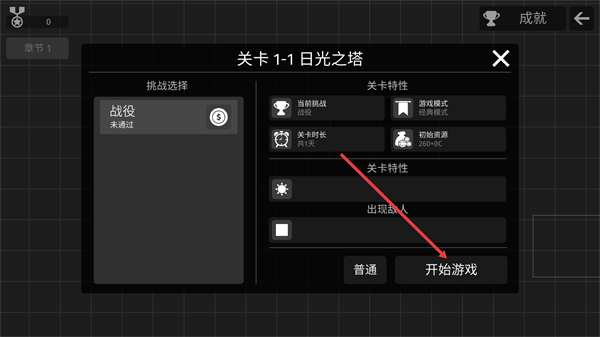 1、進(jìn)入關(guān)卡選擇界面,確認(rèn)【關(guān)卡1-1日光之塔】的信息(如初始資源、關(guān)卡時長)后,點擊【開始游戲】按鈕進(jìn)入該關(guān)卡。