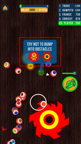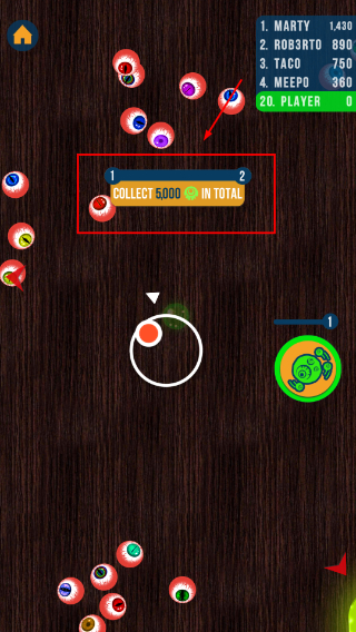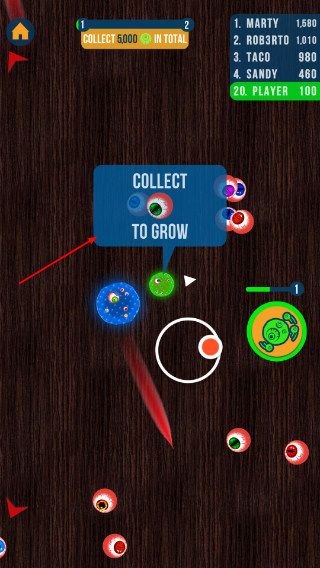 3、遵循【COLLECTTOGROW】規(guī)則收集眼球軟泥,靈活移動壯大自己,避開體型更大的對手。