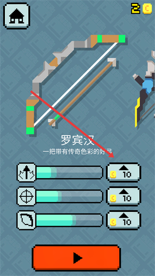 4、在武器界面羅賓漢弓箭可通過(guò)消耗金幣提升屬性,每次升級(jí)對(duì)應(yīng)屬性欄進(jìn)度增加,優(yōu)先升級(jí)射擊相關(guān)屬性增強(qiáng)弓箭的傷害與精準(zhǔn)度。