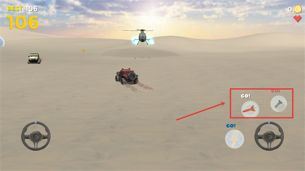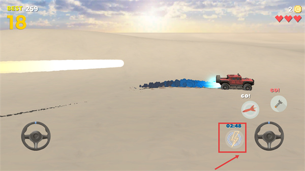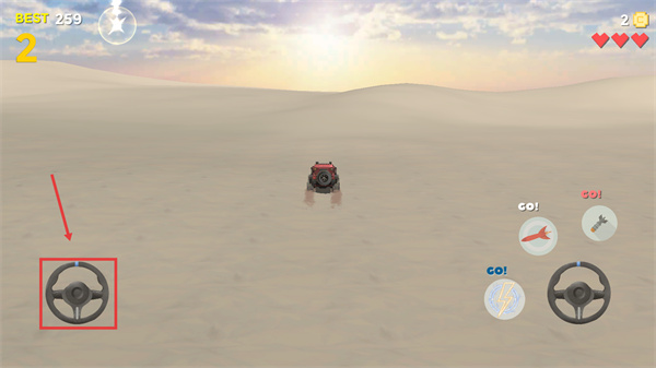 1、操控車(chē)輛時(shí)使用左側(cè)【方向盤(pán)】調(diào)整行進(jìn)方向,在沙漠地形中靈活轉(zhuǎn)向可規(guī)避障礙。