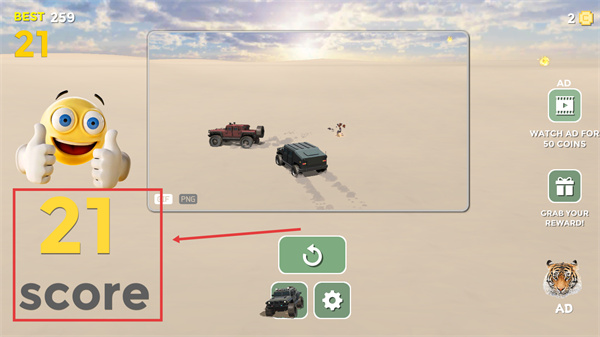 4、結(jié)算界面顯示當(dāng)前【21-score】,點(diǎn)擊重置按鈕可重新開(kāi)始挑戰(zhàn)。