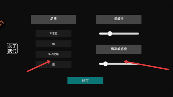 4、在設(shè)置界面可調(diào)整畫(huà)面品質(zhì)從非常低到高適配設(shè)備性能,同時(shí)調(diào)節(jié)瞄準(zhǔn)靈敏度優(yōu)化操作手感,調(diào)整后點(diǎn)擊保存生效平衡瞄準(zhǔn)精準(zhǔn)度與操作流暢度。