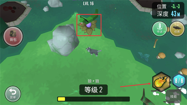 1、探索場(chǎng)景時(shí)優(yōu)先拾取【寶箱】,可獲取資源用于升級(jí);同時(shí)通過合成【狼+狼】提升等級(jí)至【等級(jí)1】。