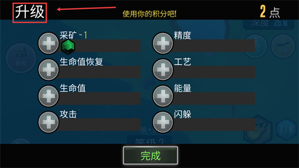 3、升級(jí)界面消耗積分強(qiáng)化屬性,優(yōu)先點(diǎn)滿【采礦~1】類資源獲取技能,再補(bǔ)充【生命值】等生存屬性。