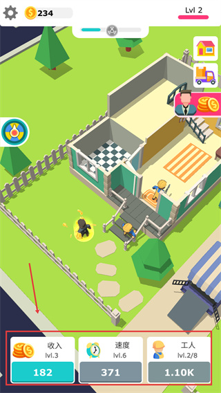1、提升【收入-Ivl.3】【速度-Ivl.6】等屬性,還可以解鎖更多【工人-Ivl.2/8】來推進(jìn)建筑進(jìn)度。