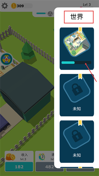 4、在【世界】界面推進(jìn)當(dāng)前區(qū)域進(jìn)度,完成后可解鎖后續(xù)【未知】區(qū)域,拓展更多建筑。