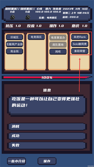 1、點擊【新游戲】進入關卡,該作是模擬電競上分的養(yǎng)成玩法,需通過各類行為提升屬性。