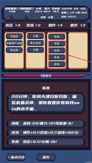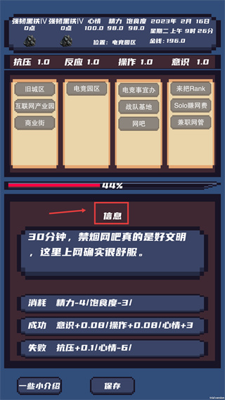 3、查看【信息】欄的反饋,參與網(wǎng)吧玩法會消耗【精力-4/飽食度-3】,成功可提升【操作-0.08】等屬性。