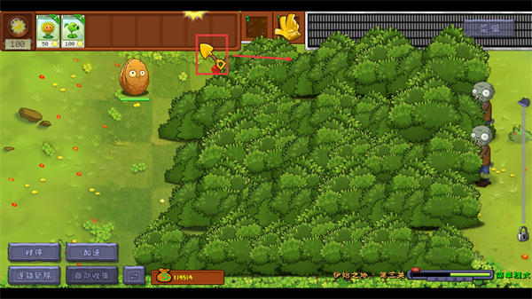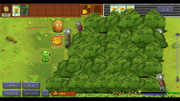 3、使用【手套】工具可移動已種植的植物,將【堅果墻】移至僵尸路徑前承傷。