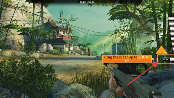 2、拖動(dòng)滑塊向上操作,實(shí)現(xiàn)鏡頭的放大變焦,調(diào)整射擊視角的清晰度,便于瞄準(zhǔn)目標(biāo)。