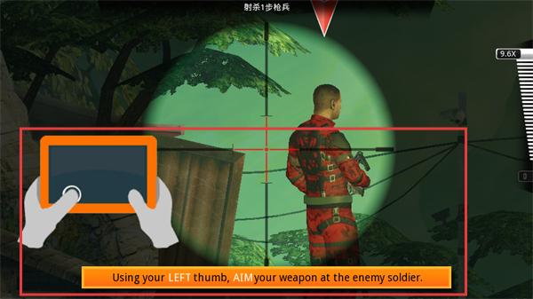 3、用左手拇指操作,將武器瞄準(zhǔn)敵方士兵,調(diào)整準(zhǔn)星位置,精準(zhǔn)對(duì)準(zhǔn)目標(biāo),為射擊做準(zhǔn)備。