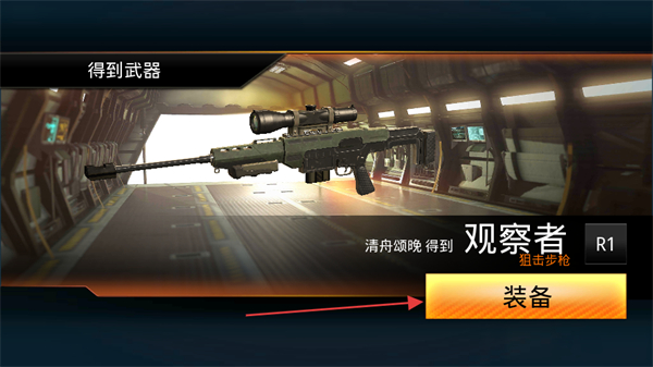 4、獲得武器后點擊裝備,將觀察者狙擊槍配備到角色,以便在射擊關卡中使用該武器。