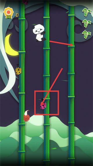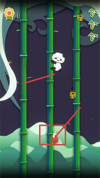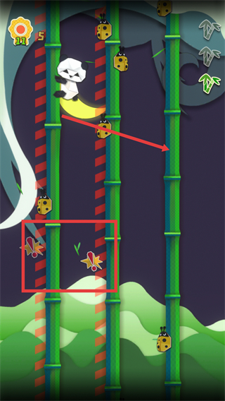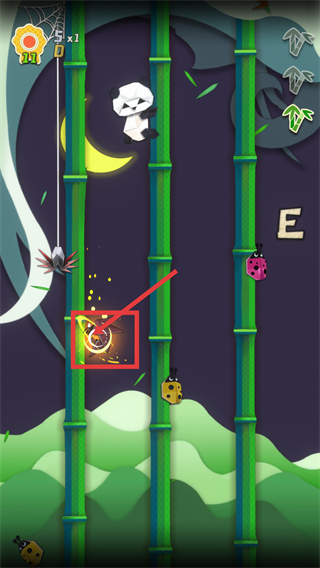 1、操控圓潤熊貓?jiān)跇錁堕g左右移動(dòng),找準(zhǔn)時(shí)機(jī)向上攀爬搶占優(yōu)勢位置,讓蟲子難以靠近。