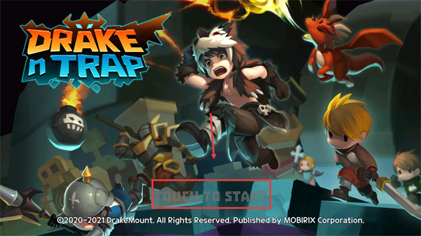 1、點(diǎn)擊【TOUCH-TO-START】啟動(dòng)【DRAKE-n-TRAP】,這是一款策略類地牢探索游戲。