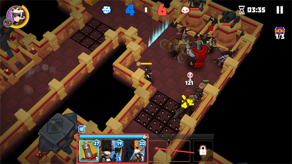 3、戰(zhàn)斗中點(diǎn)擊底部角色卡牌可釋放技能,合理搭配技能釋放時(shí)機(jī),能高效清理敵方單位并推進(jìn)關(guān)卡。