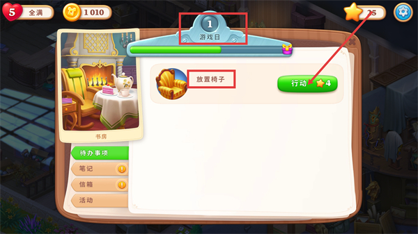 2、在【1-游戲日】的待辦中,點(diǎn)擊【放置椅子】對(duì)應(yīng)的【行動(dòng)-4】按鈕,消耗星星推進(jìn)布置任務(wù)。