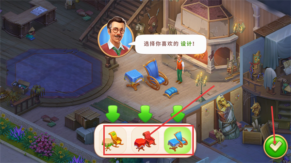 3、根據(jù)提示選擇喜歡的家具設(shè)計(jì),選定后點(diǎn)擊確認(rèn)按鈕,完成該家具的場(chǎng)景布置。