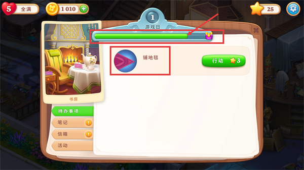4、完成椅子布置后,待辦更新為【鋪地毯】,點(diǎn)擊【行動(dòng)-3】按鈕消耗星星,繼續(xù)推進(jìn)書房裝飾。