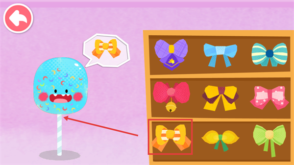 3、根據(jù)食材的需求提示,選擇對(duì)應(yīng)的裝飾配件如【黃色蝴蝶結(jié)】,為造型食材添加裝飾,提升美觀度。