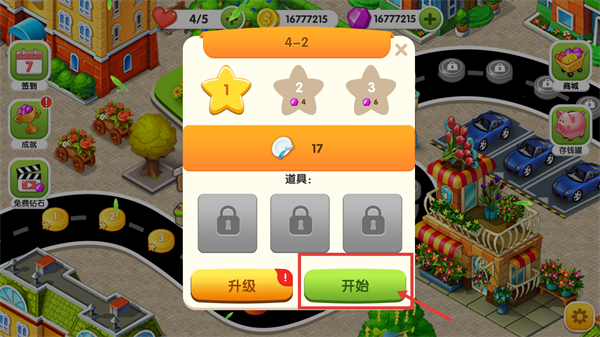 1、選擇【4-2】關(guān)卡點(diǎn)擊【開始】按鈕進(jìn)入游戲,當(dāng)前關(guān)卡可使用【17】個(gè)道具,開啟該關(guān)卡的經(jīng)營(yíng)挑戰(zhàn)。