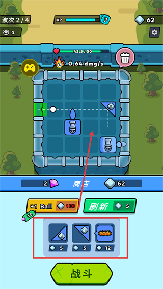 2、【商店】界面內(nèi)可以選擇道具,將炮臺(tái)布置到網(wǎng)格區(qū)域后,點(diǎn)擊底部【戰(zhàn)斗】按鈕,推進(jìn)游戲關(guān)卡進(jìn)程。