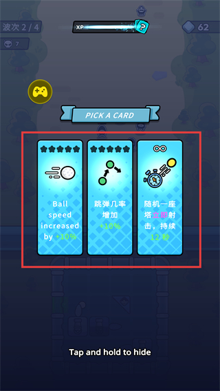 3、戰(zhàn)斗后進(jìn)入【PICK-A-CARD】界面,選擇如【Ball-speed-Increased-by-+30%】的增益選項(xiàng),提升后續(xù)關(guān)卡的戰(zhàn)斗能力。